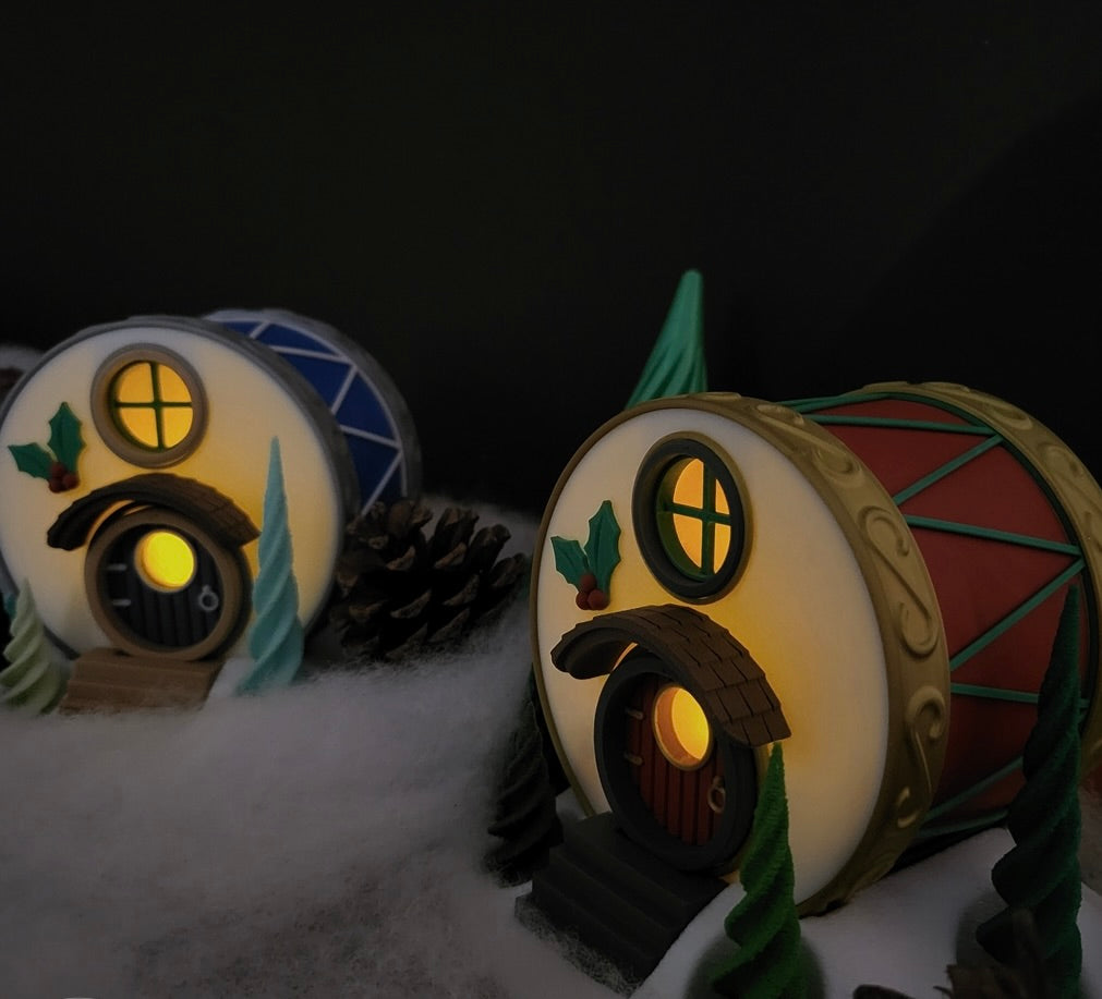 Bringe den Rhythmus der Weihnacht und den Zauber eines Wichtel-Dorfs in dein Zuhause mit unserem exklusiven3D-gedruckten Trommel-Haus! 🌟 Dieses fantasievolle Dekostück verwandelt eine klassische Spielzeugtrommel in ein gemütlicheskleines Heimdas an die Behausungen kleiner Fabelwesen erinnert. Es ist die perfekte Ergänzung für dein Weihnachtsdorf oder als eigenständigerleuchtender Akzent.